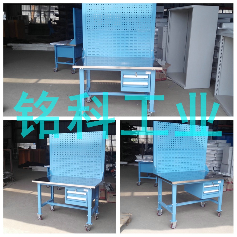 按照客戶要求,加工的工作臺(tái)臺(tái)面高度為可調(diào)式,可以移動(dòng)  可滿足不同產(chǎn)品的現(xiàn)場(chǎng)組裝需要,工作臺(tái)背面加裝工具掛板,不銹鋼包面,產(chǎn)品規(guī)格為1200*750*800 型號(hào)FHW-H1200+B*E,三層工具車規(guī)格為900*500*900